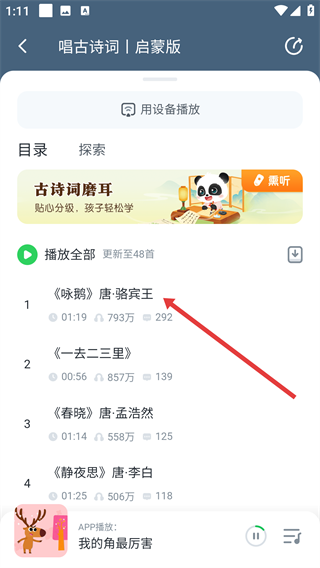 4、之后我们点击【咏鹅】等具体诗词,就能播放啦,让孩子轻松学古诗哦。