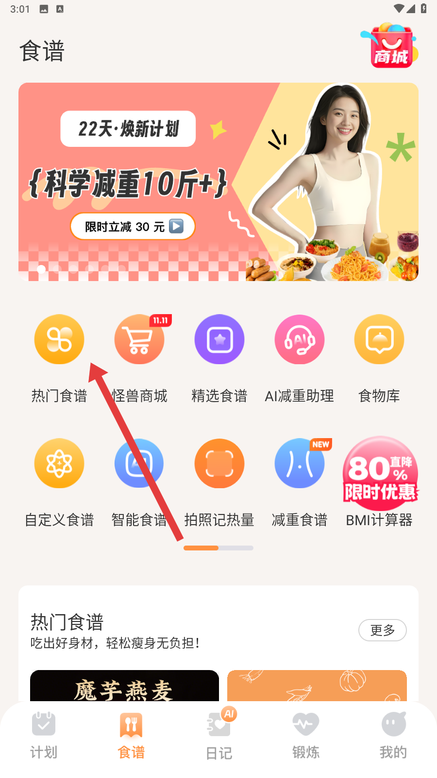 2、在食谱界面,点击【热门食谱】按钮,就能看到各类流行的减重食谱选项啦。