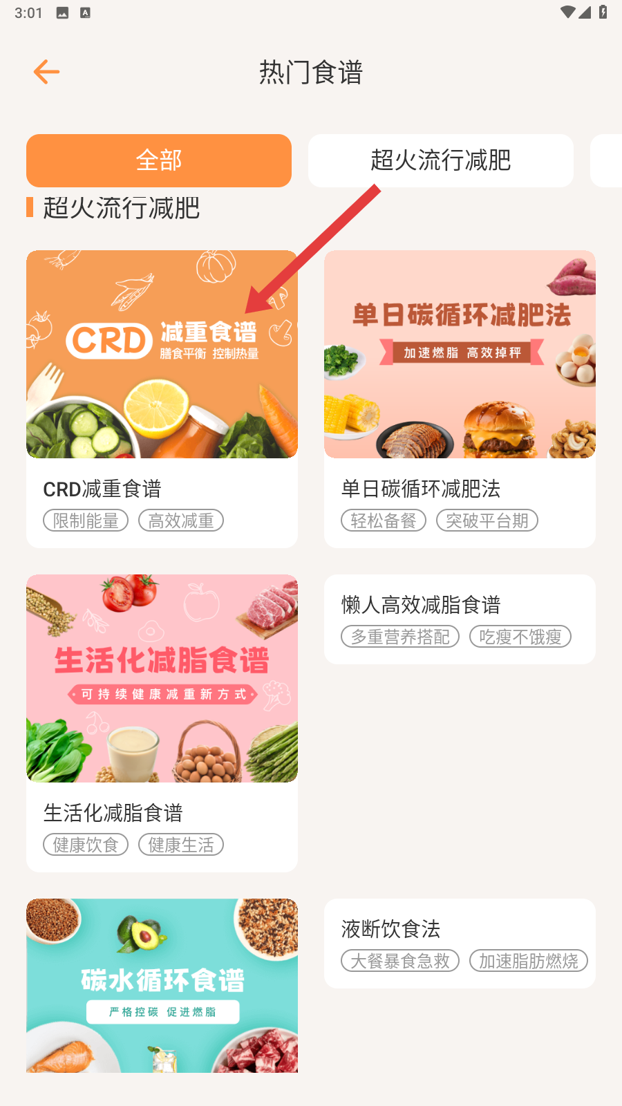 3、在热门食谱列表中,选择【CRD减重食谱】,它可是能帮我们膳食平衡、控制热量的好帮手哦。