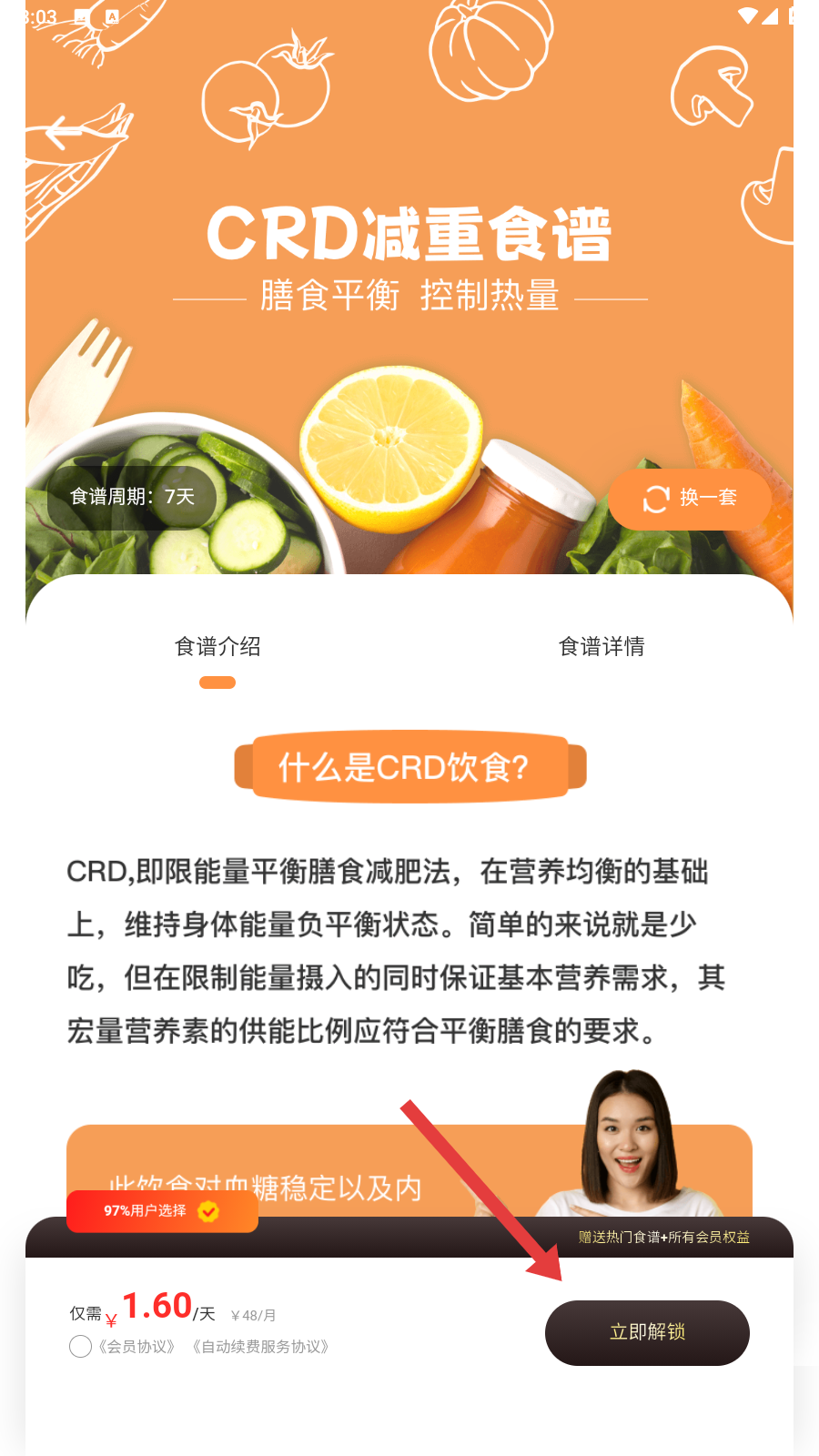 4、进入CRD减重食谱详情页后,点击【立即解锁】,就能获取这份科学的减重食谱,助力我们健康减重啦。