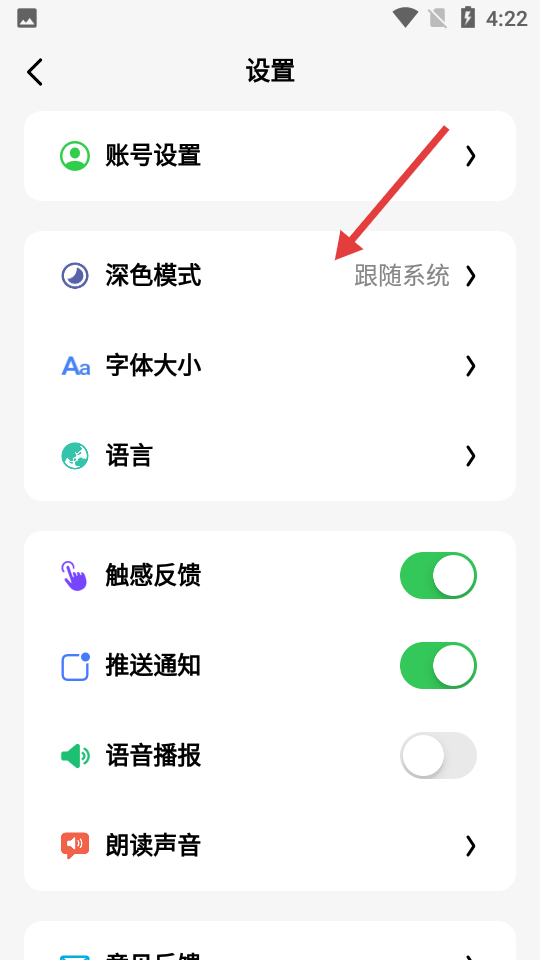 3、点击【深色模式-跟随系统】选项,进入深色模式设置界面。