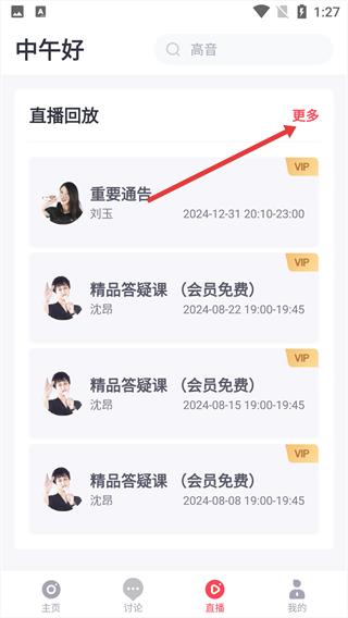 2、在直播页面,点击“直播回放”右侧的【更多】按钮。