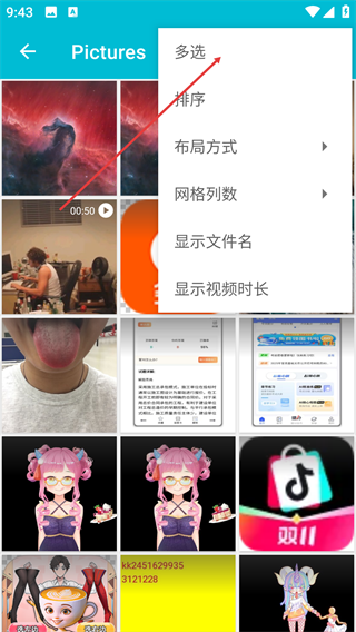 3、在弹出的功能菜单里,选择【多选】选项。