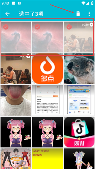 4、选中目标图片和视频,点击顶部的删除按钮,完成删除操作。