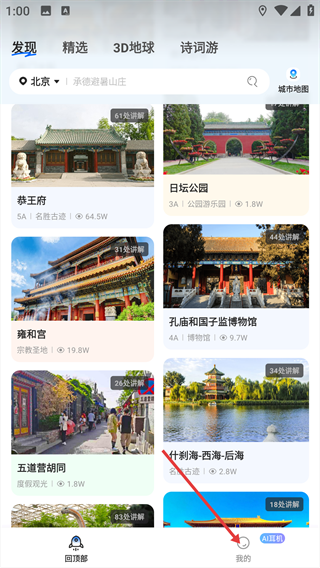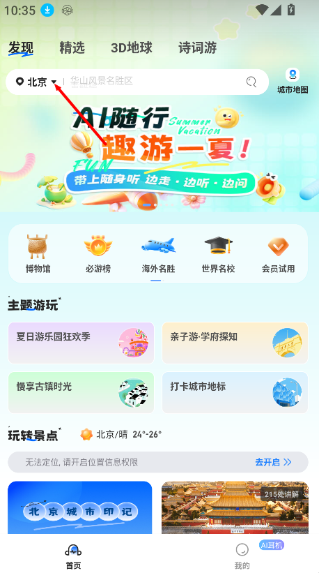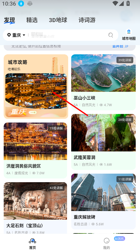 1、打开旅途随身听app,首页点击旅游城市选择入口进入界面。