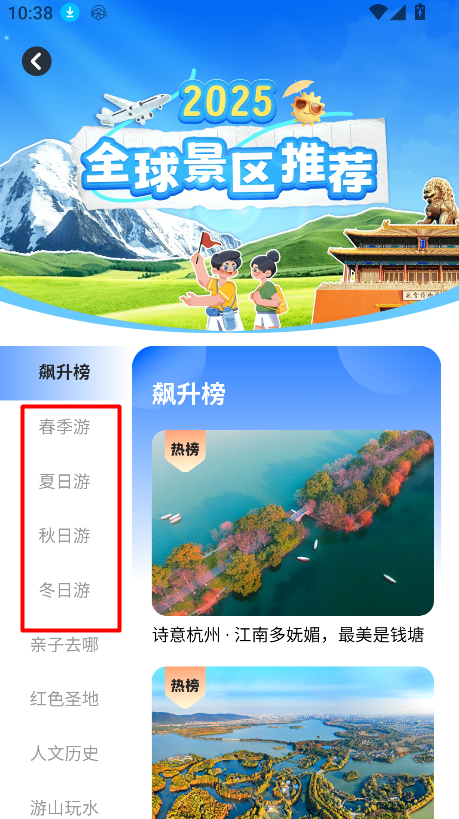 4、通过全球景区推荐功能,浏览春夏秋冬不同季节的适宜景区。