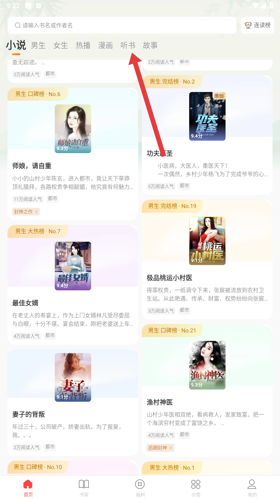 1、我们打开【连尚读书】,点击顶部【听书】标签,就能进入听书板块啦。