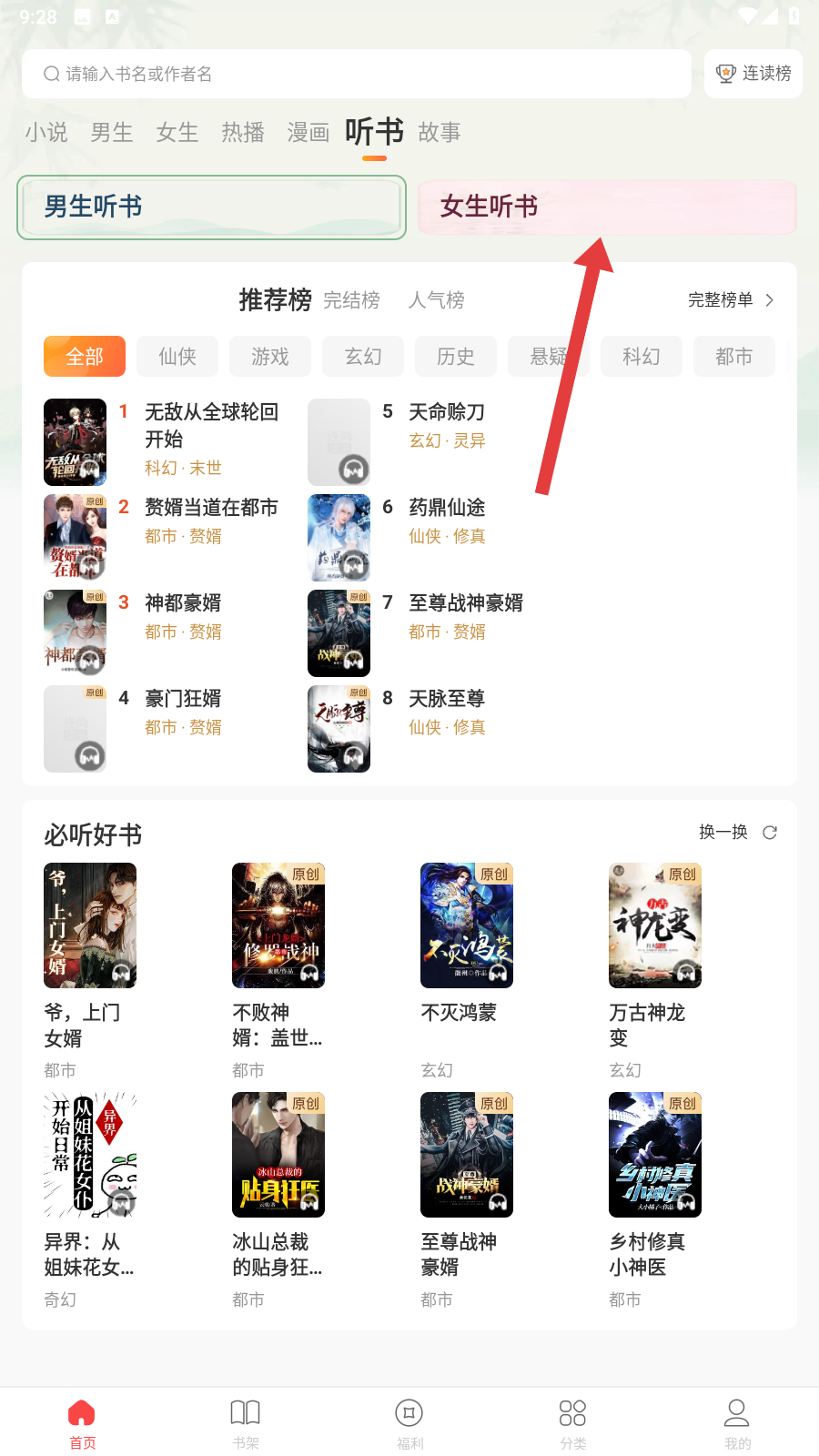 2、在听书板块,点击【女生听书】标签,即可切换到女生听书分类,找到心仪的听书内容哦。