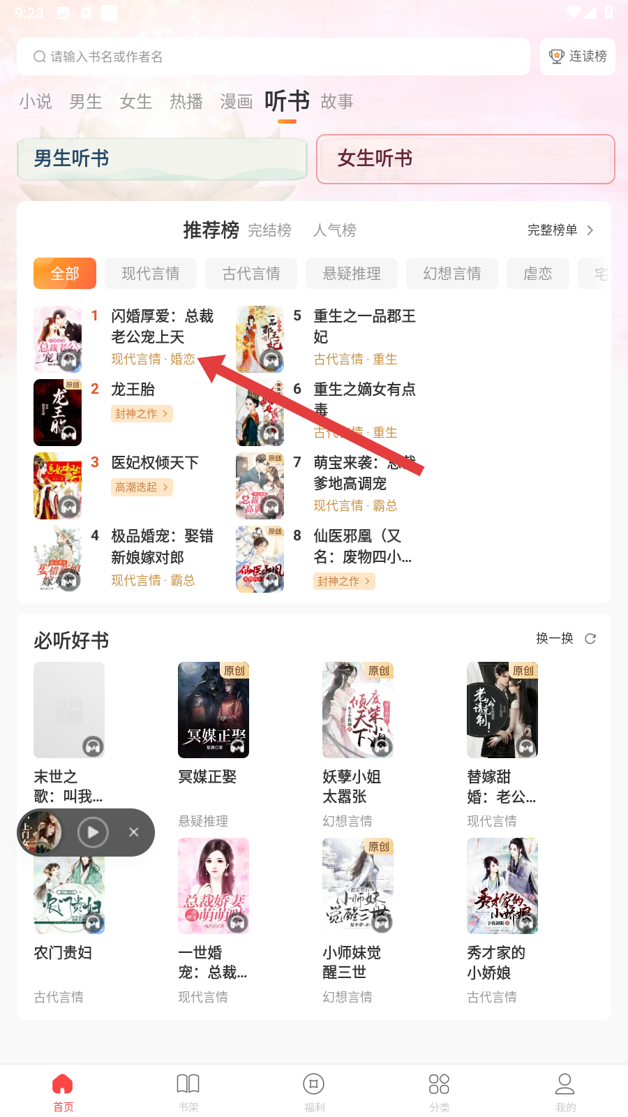 3、在女生听书分类里,选择喜欢的听书作品,比如【闪婚厚爱-总裁老公宠上天】,点击进入详情页呢。