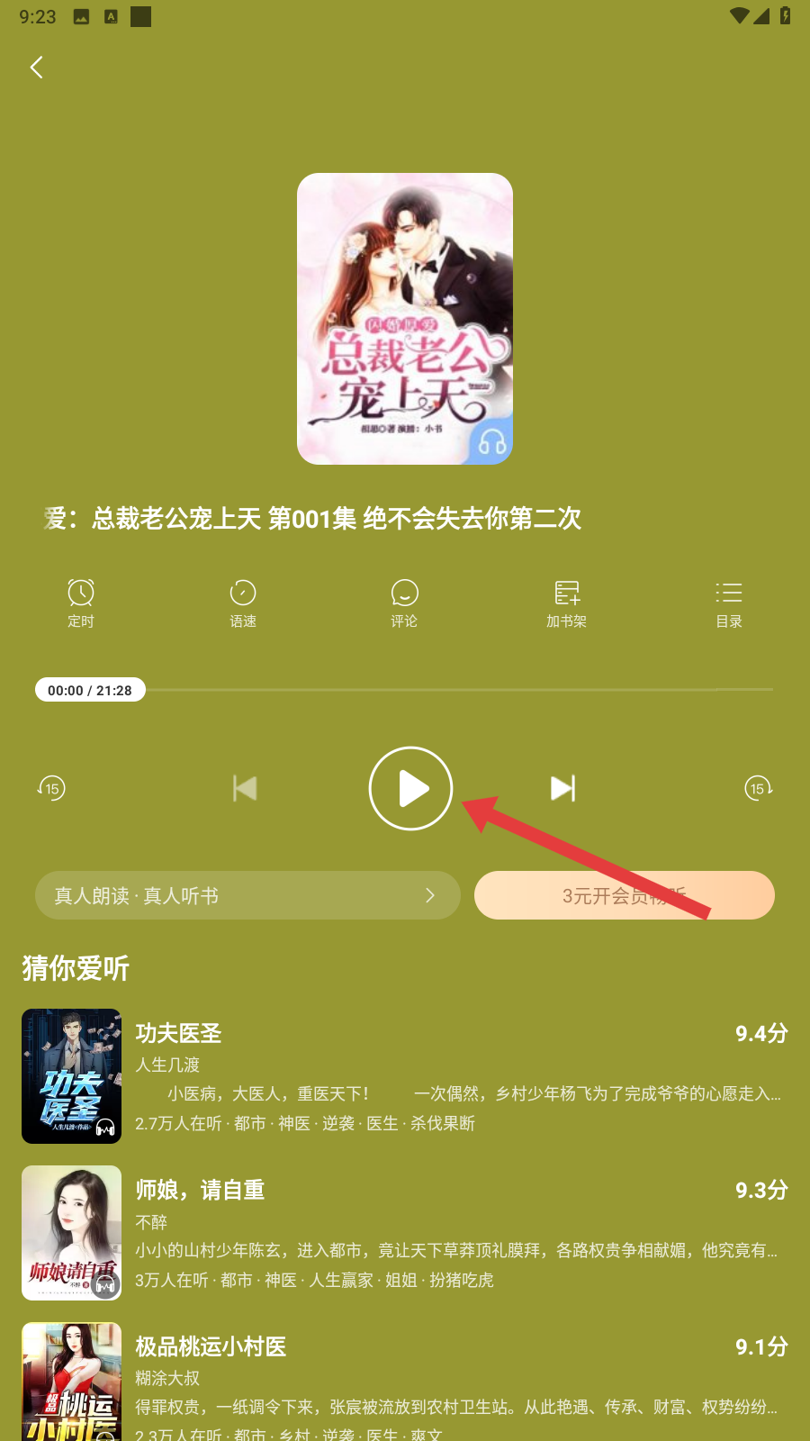 4、进入听书详情页后,点击中间的播放按钮,就能聆听精彩内容,还可以调整语速、定时等,享受听书乐趣哟。