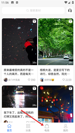 1、打开软件,点击底部【电商】,进入素材电商板块,可浏览各类素材。