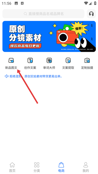 2、在电商界面,点击【新品图文】,方便挑选合适的素材哦。