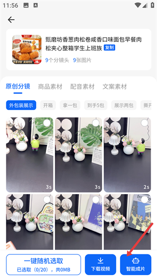 4、在商品素材界面,点击【智能成片】,可快速生成商品视频,让内容制作更高效啦。