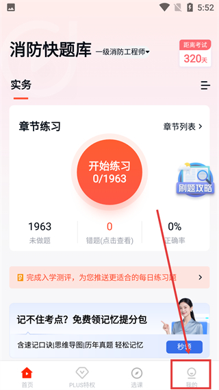 1、在【消防快题库】页面底部,点击【我的】按钮切换至个人中心。