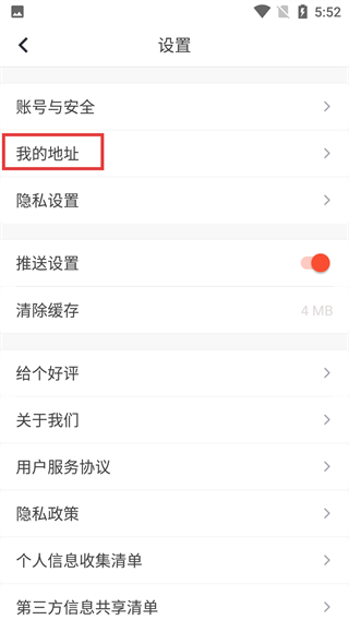 3、在设置页面,找到【我的地址】选项并点击,可进入地址管理页面。
