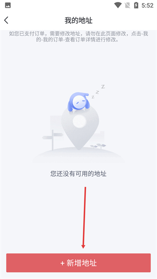 4、进入我的地址页面后,若暂无地址,点击底部【+新增地址】按钮,即可添加收货地址。