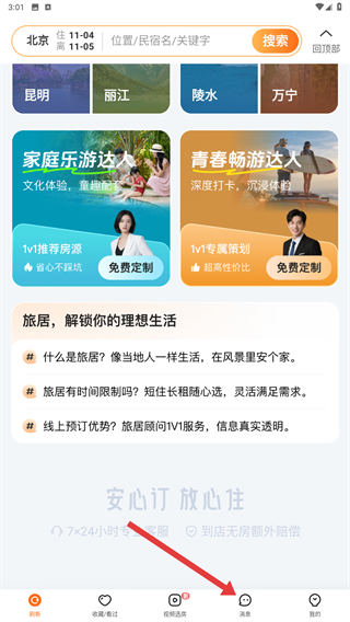 1、打开途家民宿APP,点击底部【消息】,进入消息页面哦。