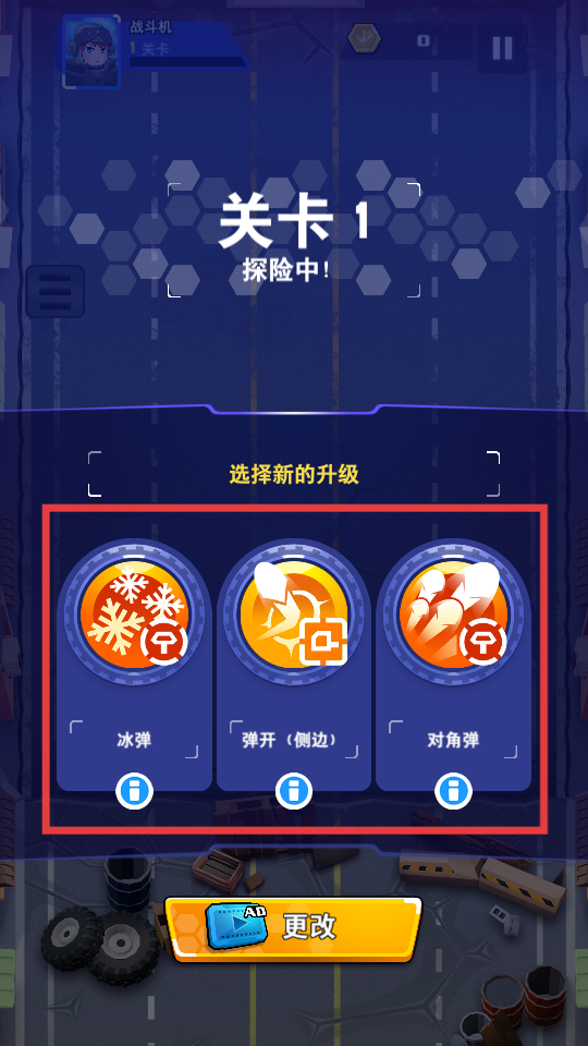 2、进入【关卡1】,自行选择红框内的升级技能强化自身进行战斗。