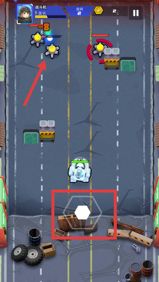 3、在战斗过程中,通过操控屏幕下方红框内的【方向键】,控制战斗机移动,躲避如【箭头】所指的敌人攻击,并进行反击。