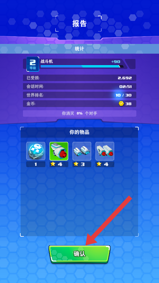 4、战斗结束后,查看【报告】界面中的统计信息,点击【确认】按钮,结算奖励并准备下一次挑战。