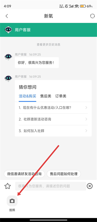 4、若有需要,我们点击【拍照】按钮上传图片,辅助说明问题,让客服更高效地为我们解答疑惑啦。
