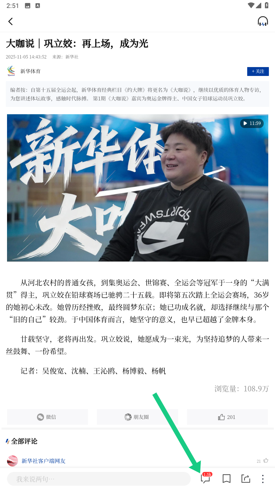 2、在体育板块中,点击感兴趣的新闻,如【大咖说-巩立姣】,进入文章详情页哦。