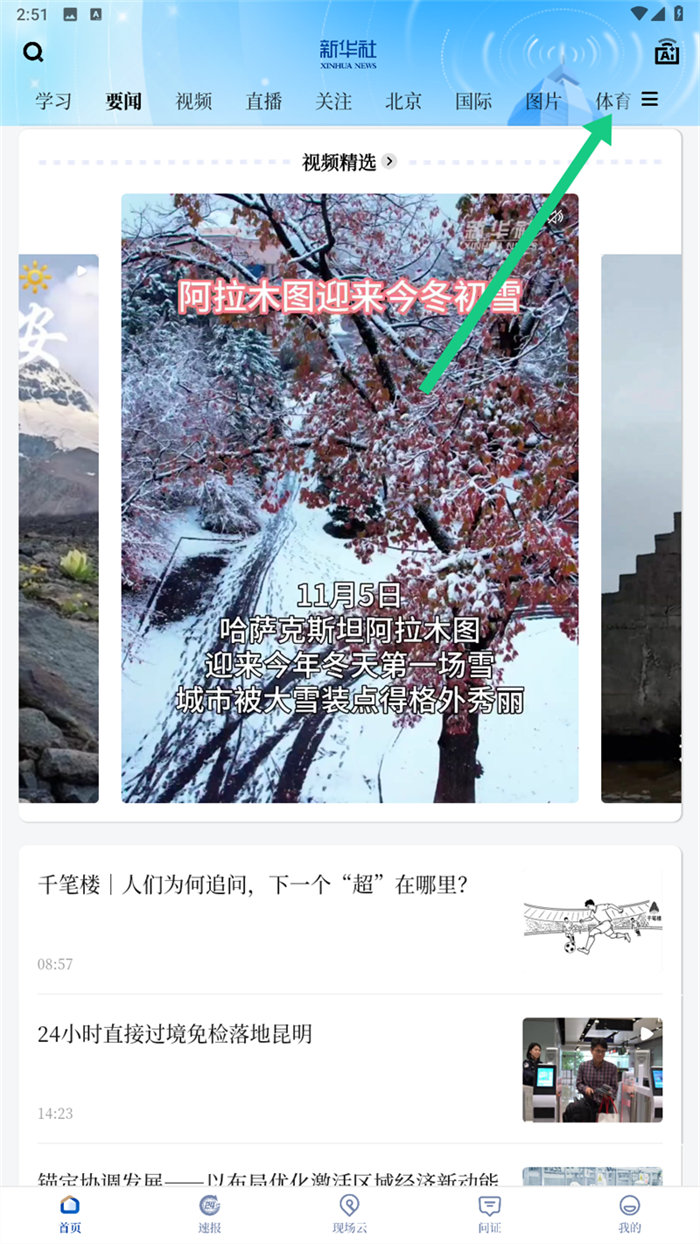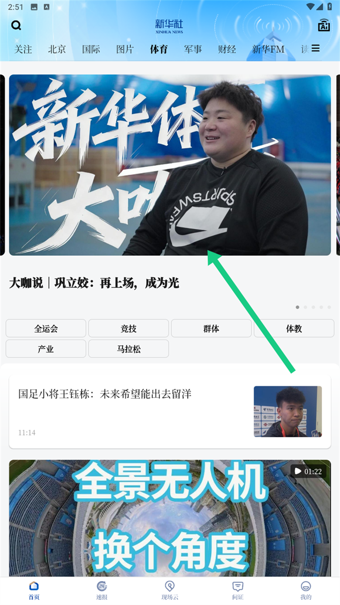 1、打开新华社,点击顶部【体育】分类,进入体育新闻板块,开始寻找想看的新闻文章吧。