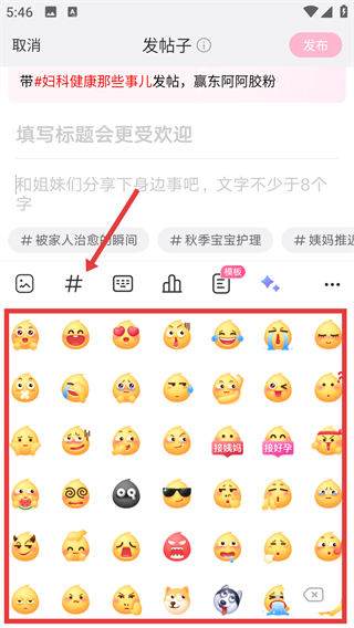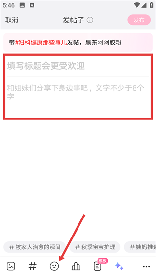 2、在发帖子页面,我们填写标题和分享内容,还可以点击底部表情图标,为帖子增添趣味哦。
