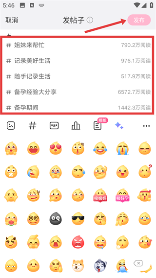 4、选好表情后,我们再选择相关话题标签,最后点击右上角发布按钮,就能成功发表帖子哟。