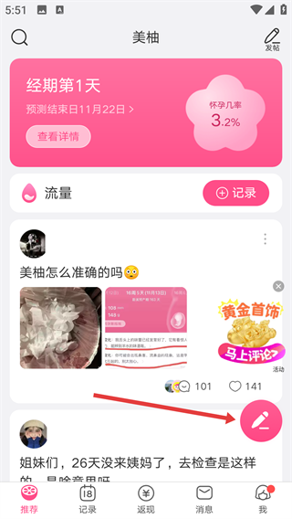 1、我们在美柚推荐页面,点击右下角粉色发帖笔图标,进入发帖子的编辑界面啦。