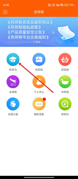 1、我们可以点击【药学习】按钮,进入药学学习板块,开启专业药学知识学习之旅呢。