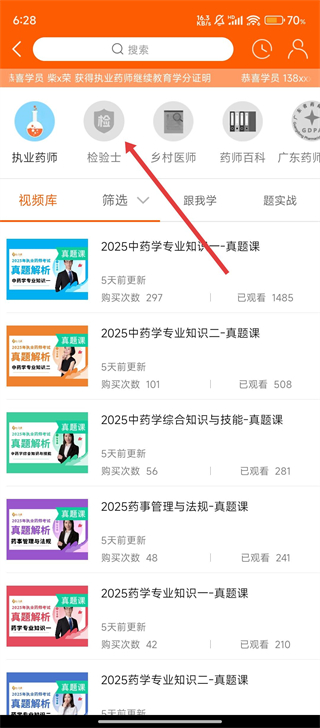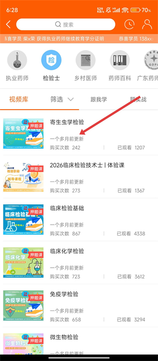2、在药学习板块中,点击【检验士】分类,就能找到检验士相关的课程资源哦。