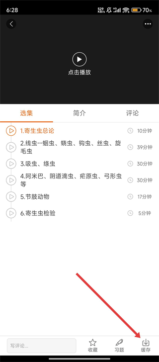 4、进入课程后,点击【缓存】按钮就能下载该课程,方便离线学习寄生虫学检验知识哟。