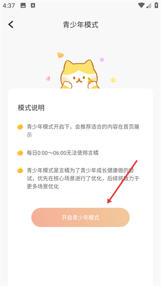 3、在青少年模式说明页面,点击“开启青少年模式”按钮。