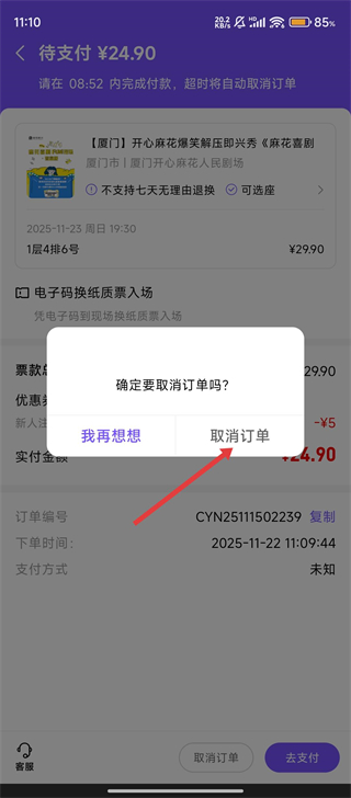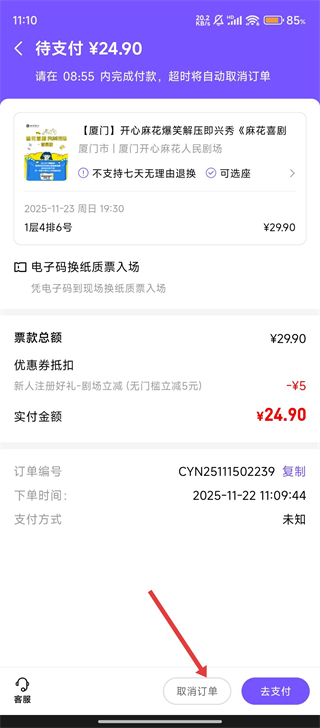 3、进入待支付页面后,点击【取消订单】按钮,操作一步到位,简单便捷呢。