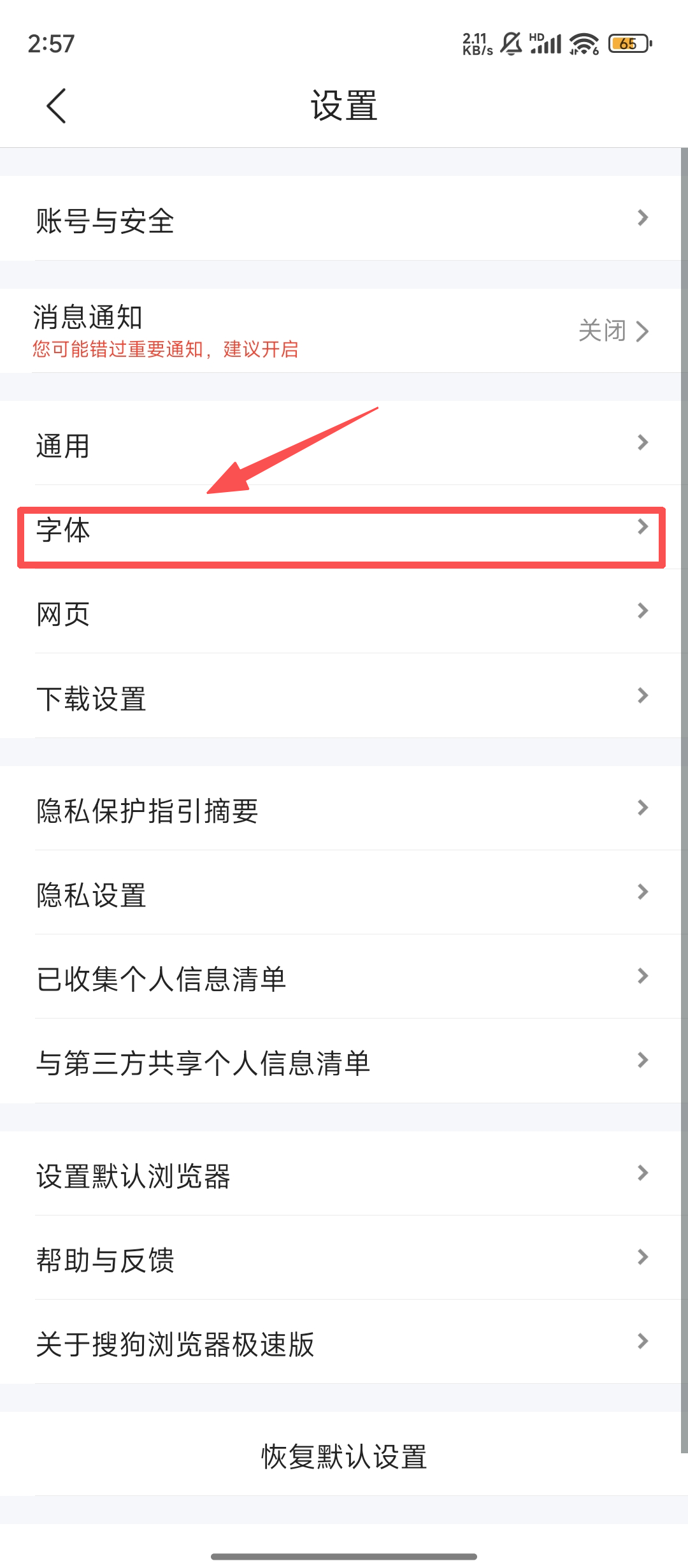 3、进入设置页面后,找到【字体】选项并点击,就能进入字体调整的具体页面啦。