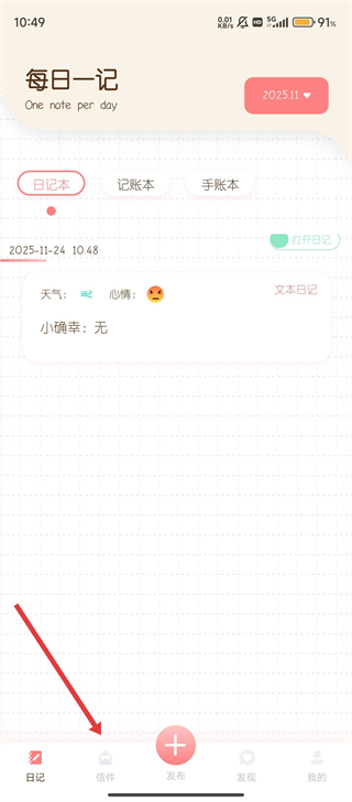 1、我们打开随笔日记app,点击底部【信件】按钮,就能进入匿名信件功能页面啦。