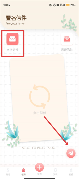 2、在匿名信件页面,我们点击右下角纸飞机形状的按钮,即可进入写信类型选择界面哦。