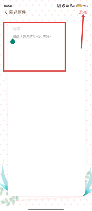 4、我们在匿名信件编辑框中输入称呼和内容后,点击右上角【发布】按钮,就能完成匿名信件的发送啦。