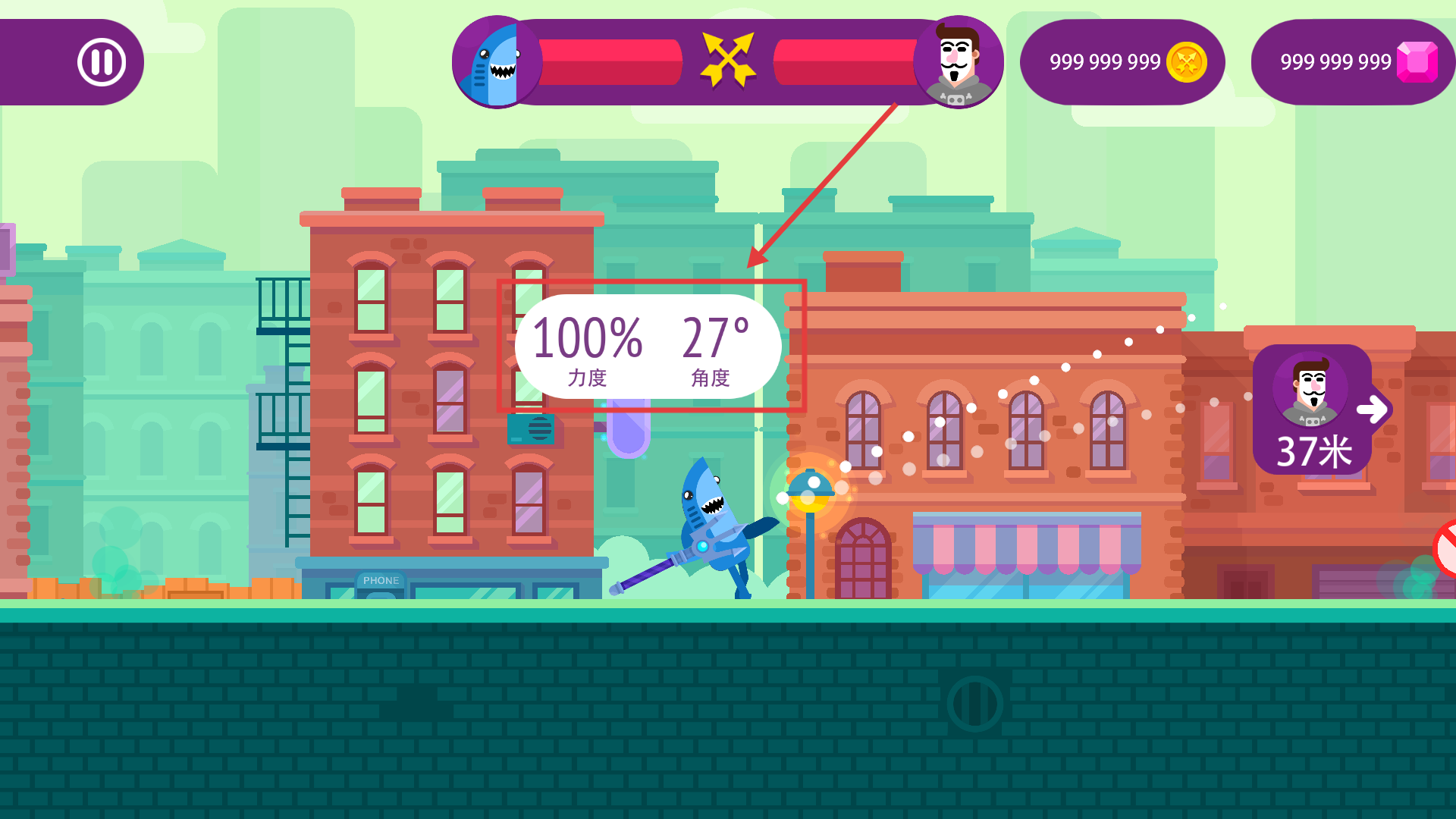 1、调整【100%力度-27°角度】,瞄准发射,能有效击中【37米】外的对手。