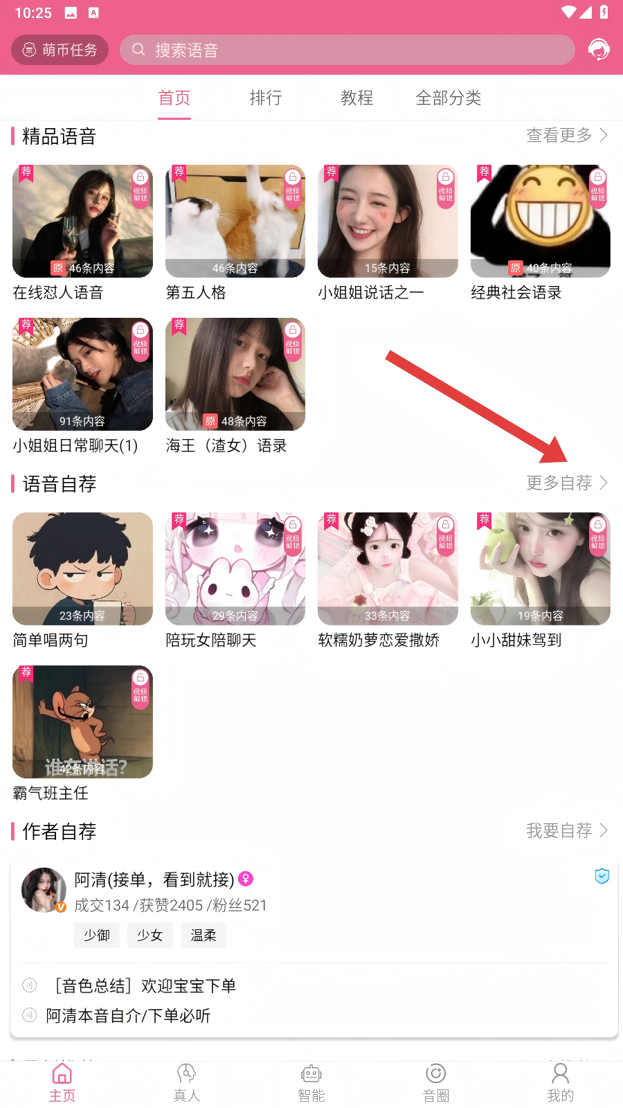 1、我们打开萌配音APP,在主页找到【语音自荐】板块,点击【更多自荐】,进入语音包选择页面哦。
