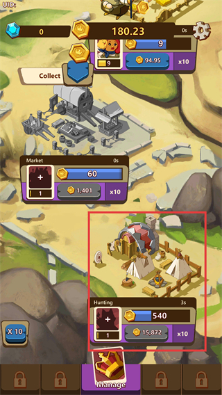 1、优先升级【Hunting】模块,利用其每【15秒】产出的【540】金币,快速积累资源解锁更多功能。