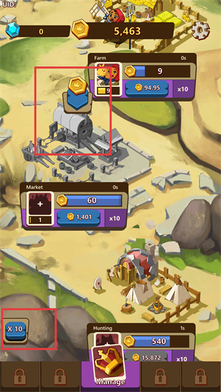 2、点击收集【金币】,点击倍数x10,可一次性获取十倍资源,大幅缩短积累时间,提升前期发展效率。