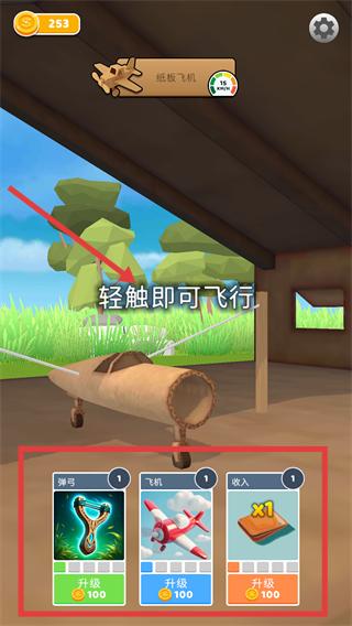 1、在初始界面查看【纸飞机-2级】,按“轻触即可飞行”提示操作,可消耗100货币升级【道具】【飞机】【收入】提升属性。