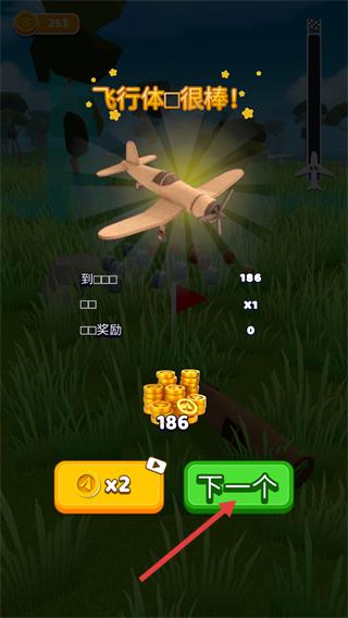 4、飞行结束后获取【186金币】奖励,点击【下一个】按钮,进入下一轮飞行挑战提升飞机等级。