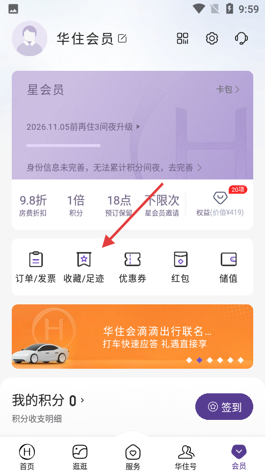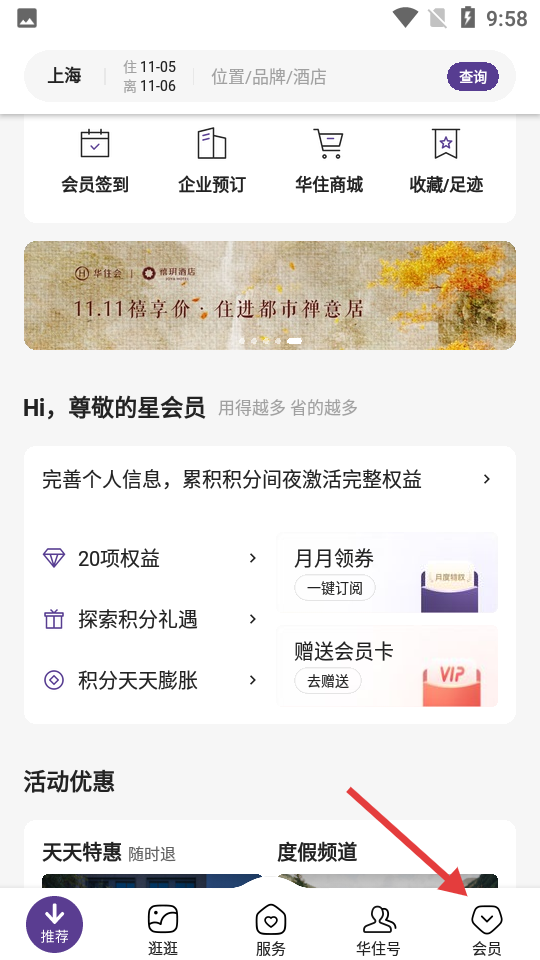 2、会员权益丰富:积分可当钱花,兑换房费或商城好物,还有会员专享自助选房,享受优先选房特权。