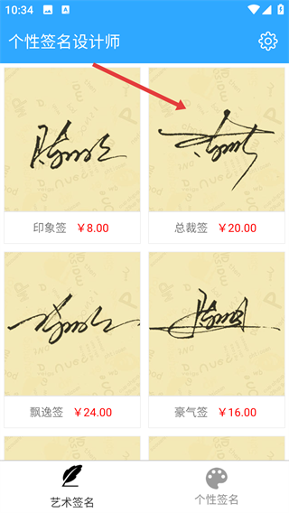 1、打开【个性签名设计师】,在【印象签】、【总裁签】等多样风格中挑选喜欢的哦。