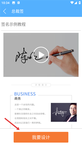 2、选定【总裁签】后,点击【我要设计】按钮,就能进入签名设计的关键流程,离专属签名又近一步啦。