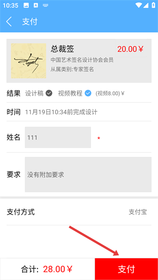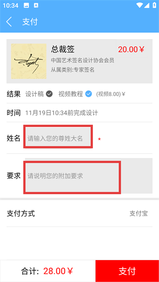 3、在支付页面,仔细填写【姓名】和附加要求,每一项都认真对待,这样设计出的签名才更贴合心意哦。