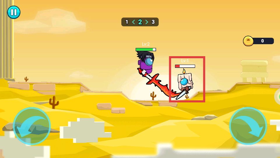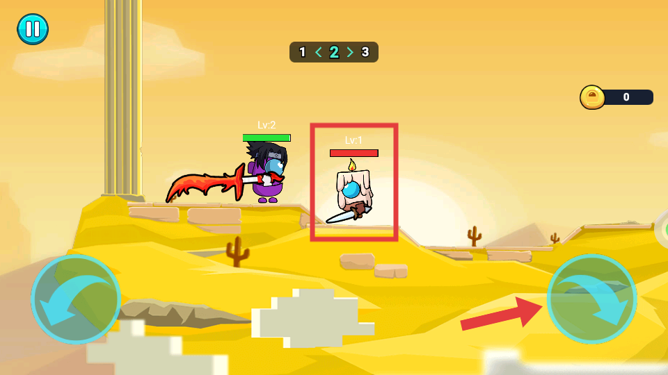 2、进入关卡后,通过屏幕左下角和右下角的方向按钮操控角色移动,进行攻击红框内的敌人。